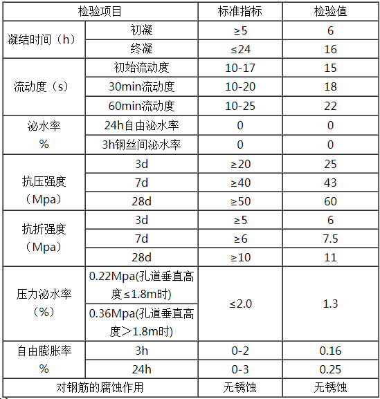 1.流動性好,初始流速小于17s,無收縮、自密實、強(qiáng)度高,不泌水、不分層。