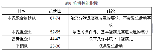 用水泥聚合物砂漿鋪裝10mm厚,20℃養(yǎng)護(hù)7天后,用便攜式抗滑性能測試儀(TP-30型)測定水侵濕后的鋪裝面抗滑。