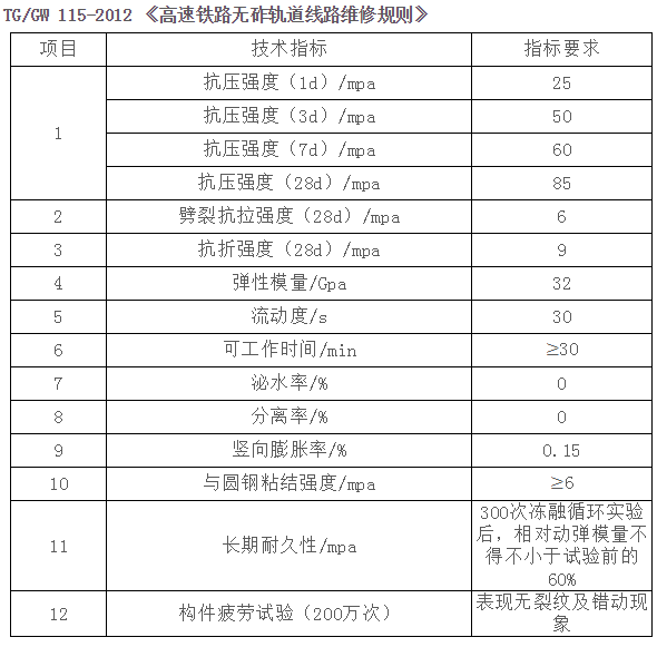 4、灌注過(guò)程:①攪拌:CGM-5砂漿的推薦配合比為水:料=19%,根據(jù)設(shè)計(jì)所需要的流動(dòng)度可適當(dāng)調(diào)節(jié)用水量,配合比范圍水料比18-20%,攪拌時(shí)間為3-5min。②灌注:將輸漿管接到道床板的灌漿孔上,直接進(jìn)行灌注;并觀察模板上的排氣孔。當(dāng)有漿體稠度與注入的稠度相同時(shí),即可將排氣孔堵住,完成灌注。③清洗:每班澆筑完畢后,清洗攪拌機(jī)、輸漿管以及粘附有砂漿的工具。④拆模和養(yǎng)護(hù):按一般的方法即可